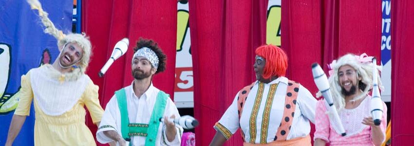 Circus Amok…reinventing the circus form, borrowing drag fabulousness from Charles Ludlam’s Theater of the Ridiculous, large scale transformation using whole-body masks from Bread and Puppet Theater, and the outdoor bally and verbal rhythm and repertoire from the sideshow, as well as movement vocabulary from post-modern dance. The troupe balances danger with laughter, slipping its critique between the pies in the face and the surreal, scary, and sometimes gender-bent characters of the charivari. –Mark Sussman, in Disturbing the Peace: 20th Century Radical Street Performance, 2001